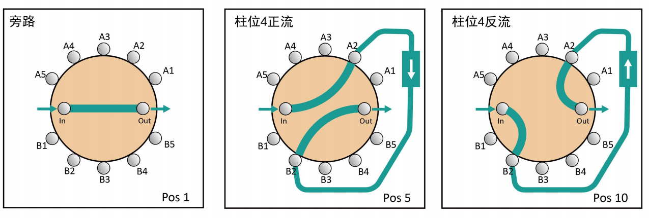 柱閥可以接入多達5根色譜柱,通過切換閥位使各色譜柱單獨串入系統中: